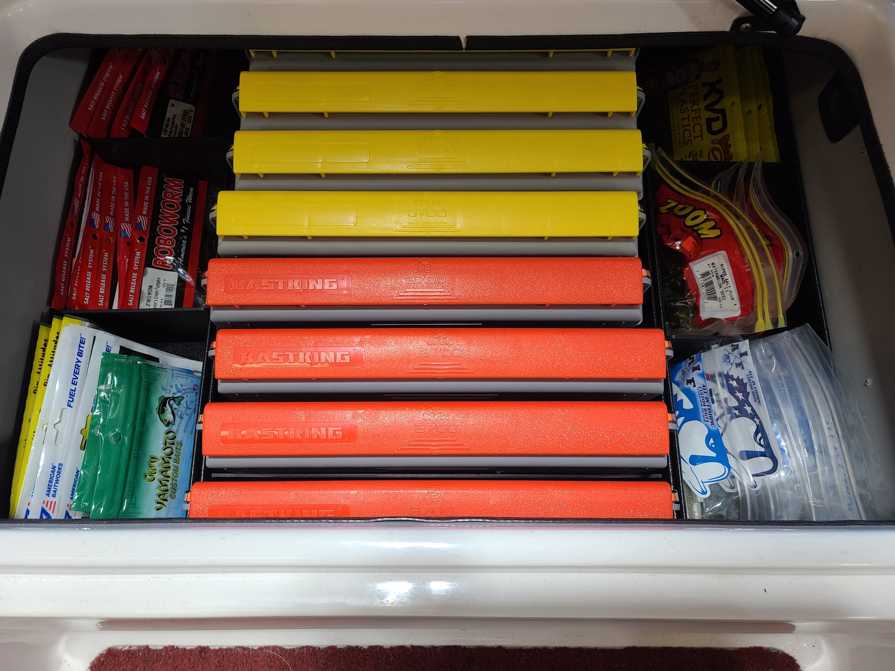 Here’s the ideal tackle organization system for the front deck compartment on the 1993 Stratos 201 PRO XL. This kit will hold eight (8) Plano 3700 series boxes. Includes side trays for soft plastics storage.